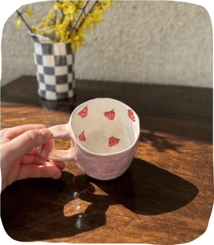 🍓Kézzel készült 230ml bögre tavaszi hangulattal, belsejében apró eper mintával.